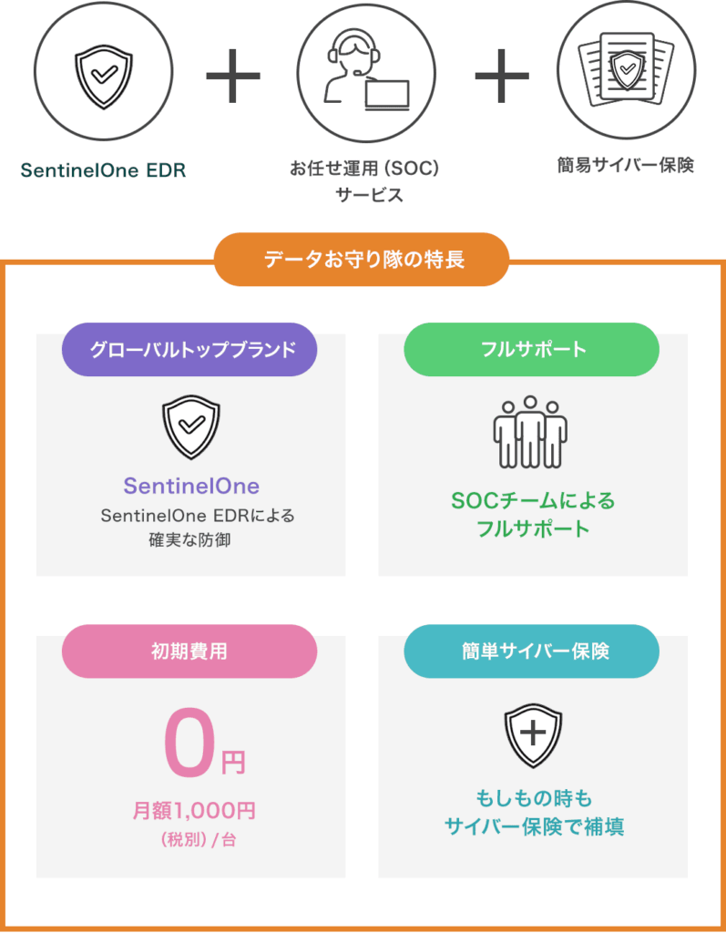 「EDR+SOC+簡易サイバー保険」がセットになったセキュリティサービスです。