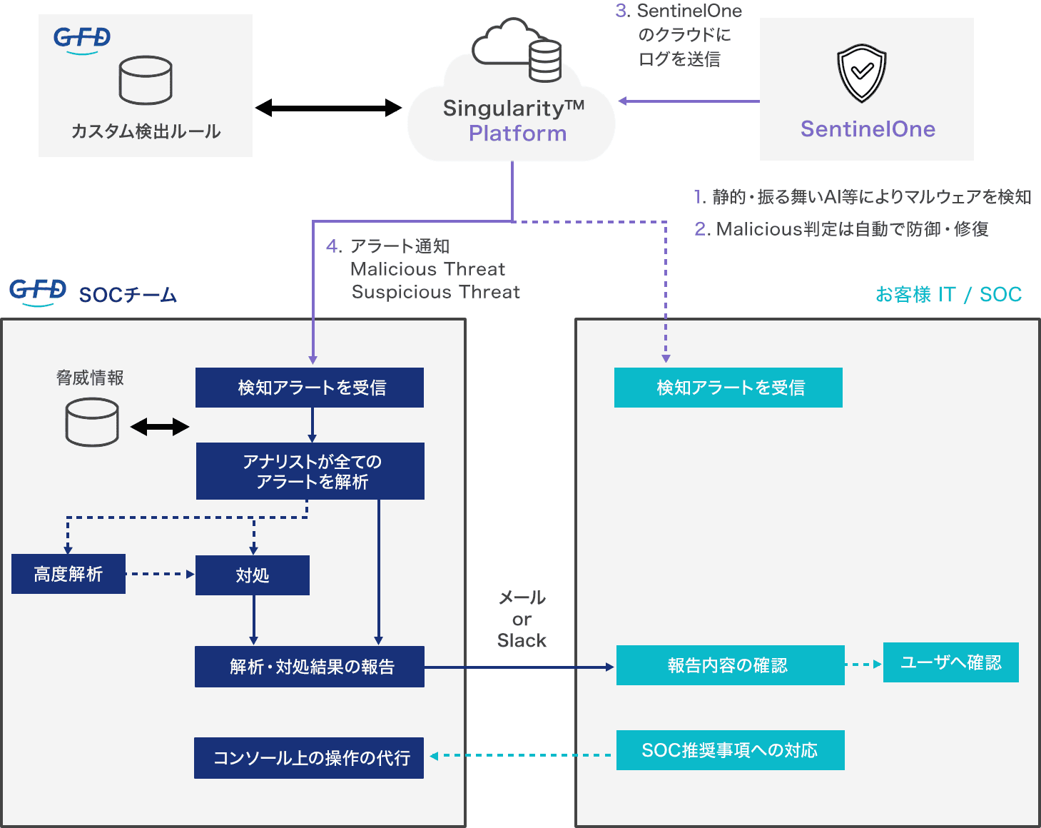 SOC(セキュリティオペレーションセンター)はアラートの分析やお客様側の推奨作業をお知らせするだけではありません。サイバー攻撃の抑止作業、マルウェアの駆除、改ざんされたシステムのロールバック、設定変更作業もいたしますので、お客様での運用の手間がかかりません。日本語英語対応ですので海外拠点も安心です。