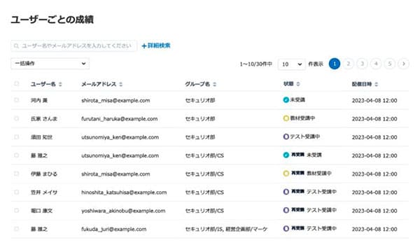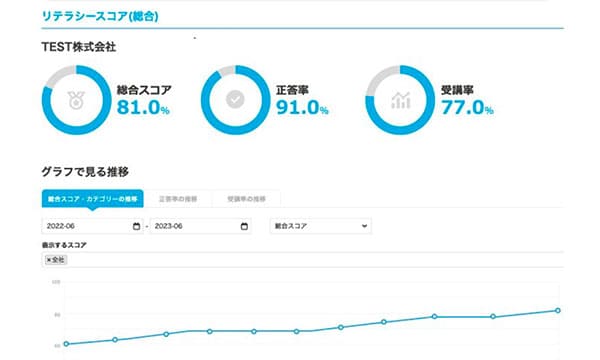 従業員ごとの解答状況、苦手なカテゴリ、全社のスコア推移、グループごとのリテラシー状況などが自動集計